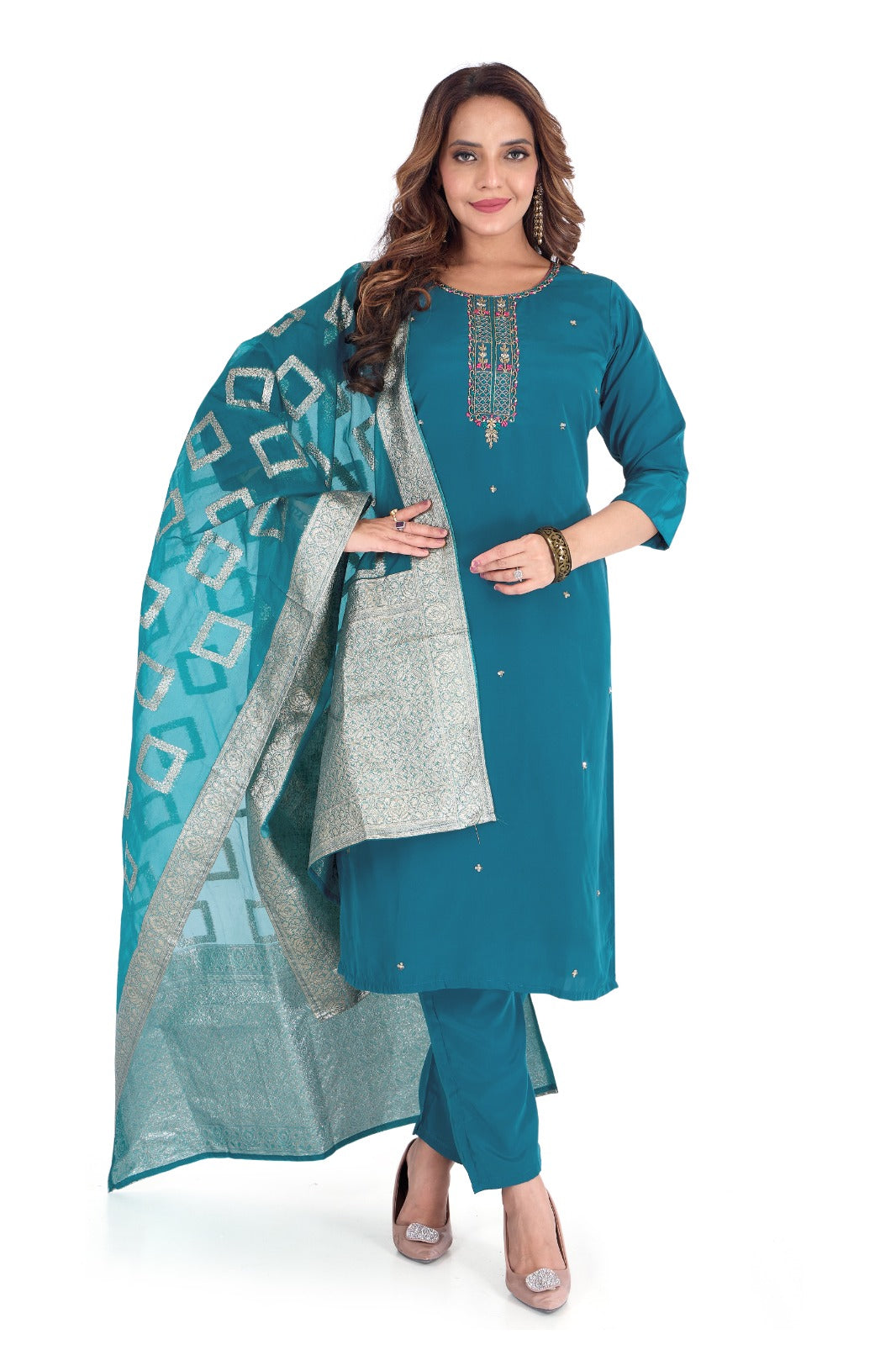 Drape yourself in majestic elegance with this teal-toned beauty, designed in rich Makhan crepe fabric. A beautifully embroidered neckline and scattered dainty embellishments turn this outfit into a true festive must-have.