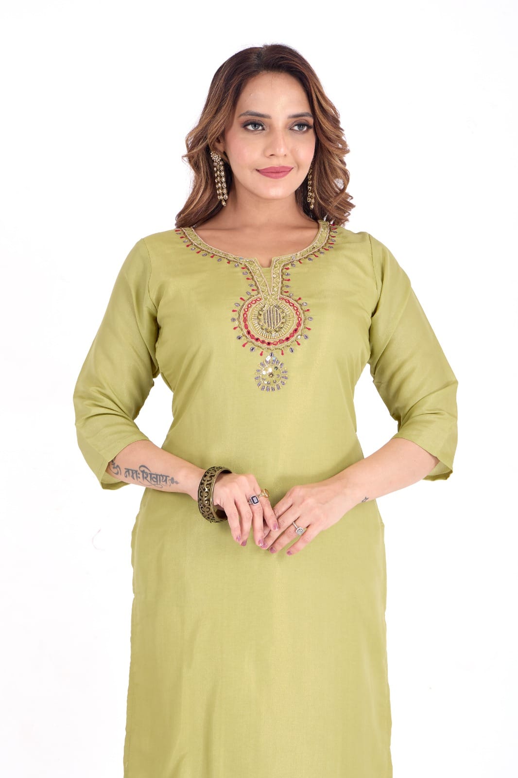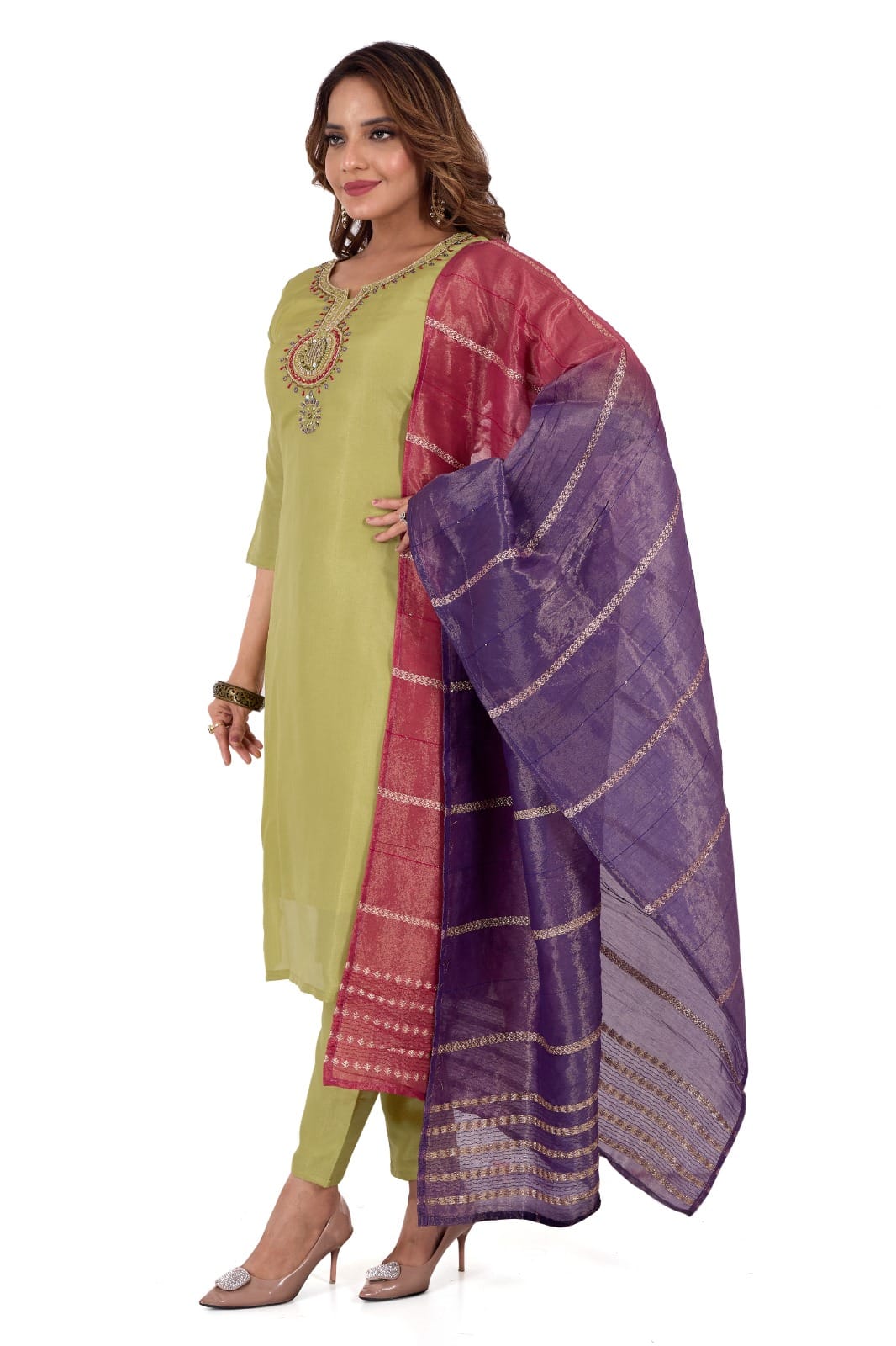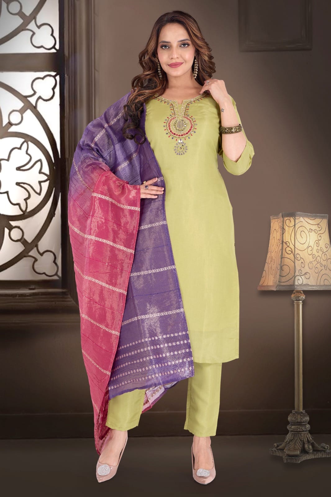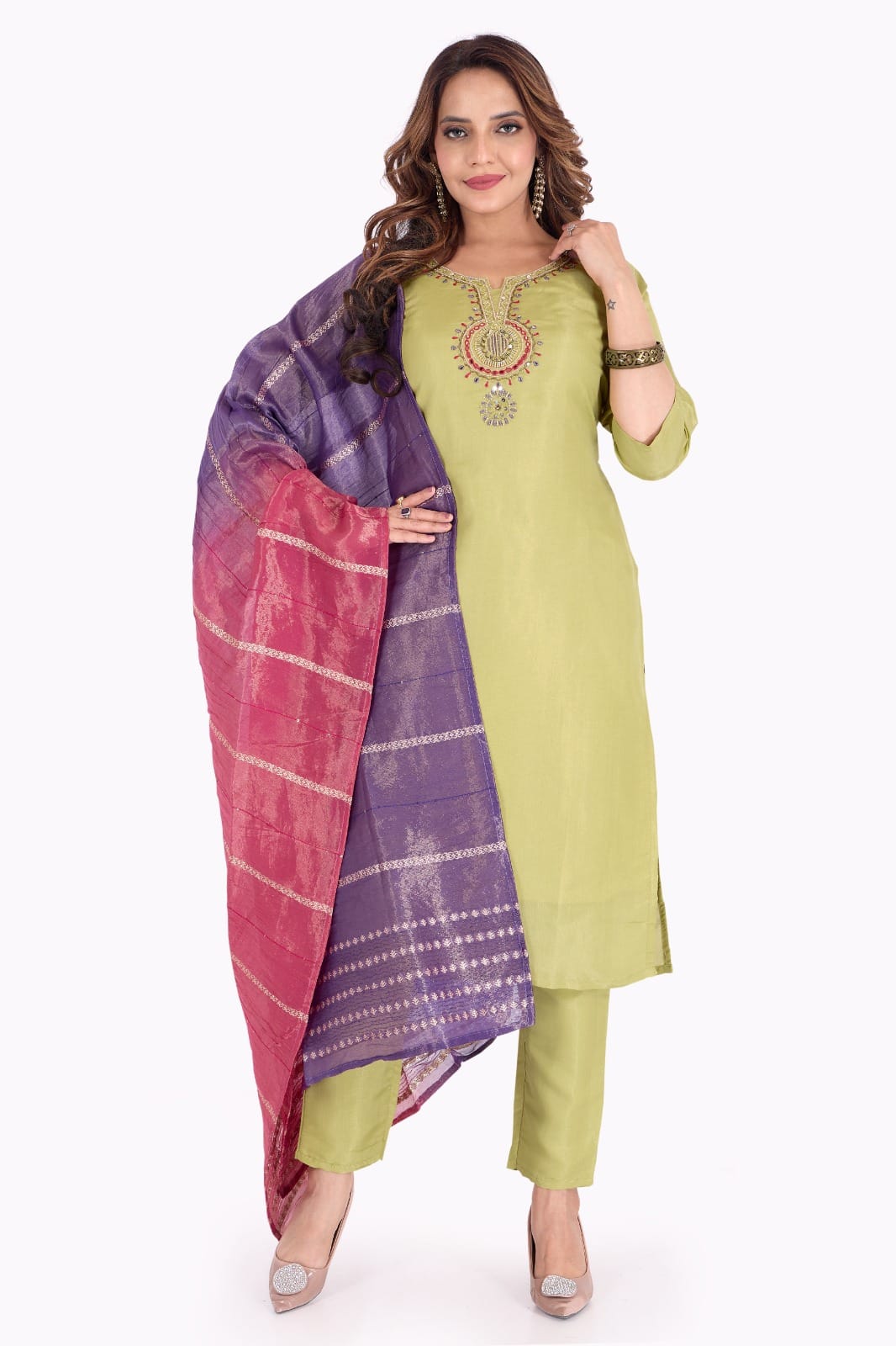 Step into a world of sophistication with this elegant lime green Sigara Silk suit, featuring intricate embroidery on the neckline that adds a regal flair to your ensemble.