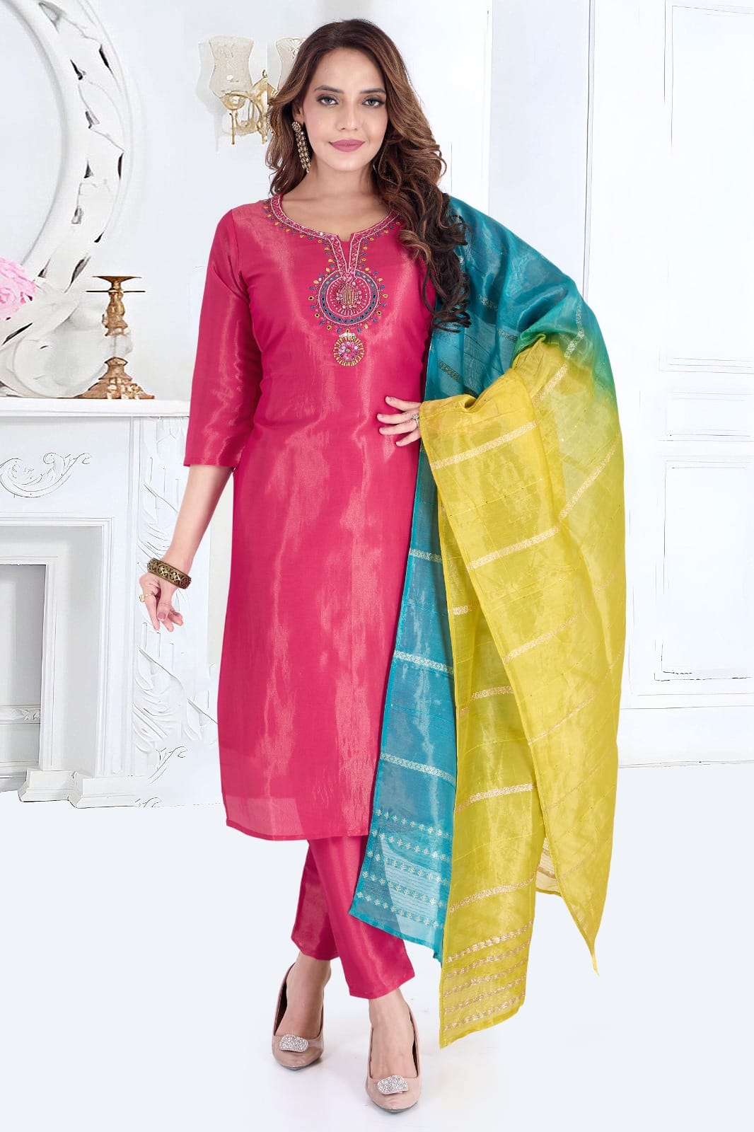 Drape yourself in radiance with this eye-catching fuchsia silk suit set β a flawless blend of luxurious fabric, exquisite embroidery, and timeless elegance.